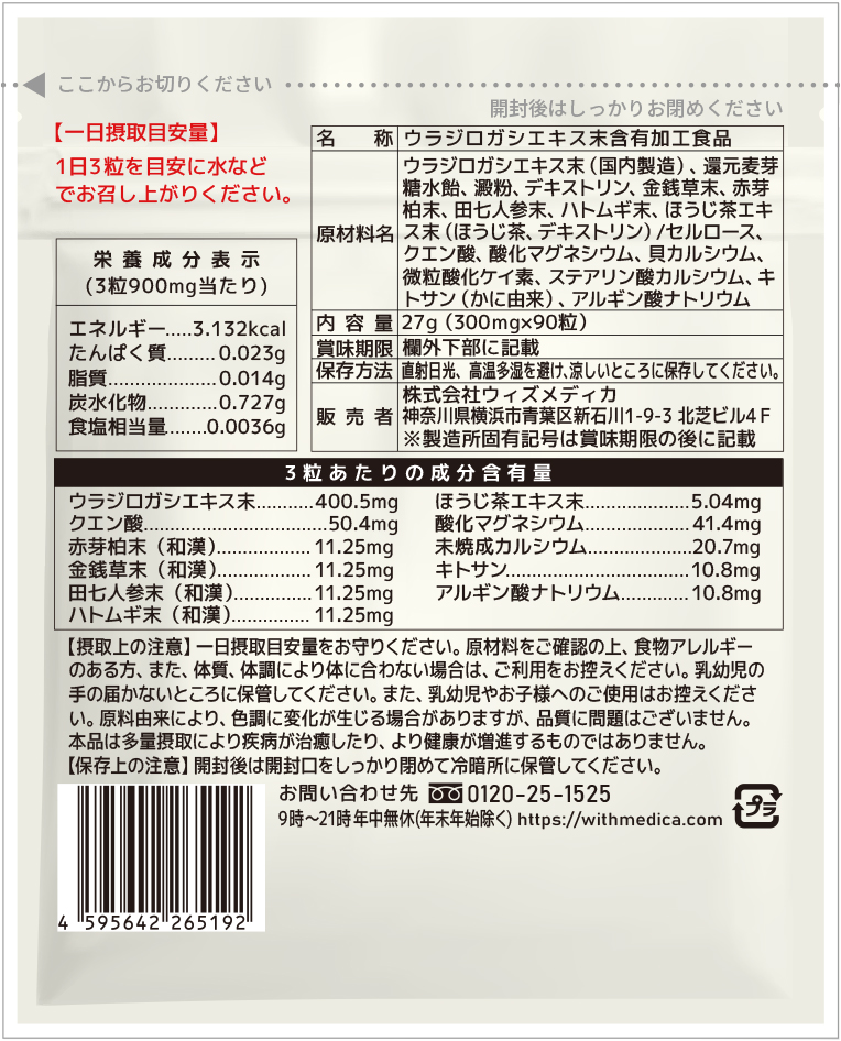 | 原材料名 | ウラジロガシエキス末(国内製造)、還元麦芽糖水飴、澱粉、デキストリン、ほうじ茶エキス末(ほうじ茶、デキストリン)、金銭草末、赤芽柏末、田七人参末、ハトムギ末/セルロース、クエン酸、酸化マグネシウム、貝カルシウム、微粒酸化ケイ素、ステアリン酸カルシウム、キトサン(カニ由来)、アルギン酸ナトリウム |