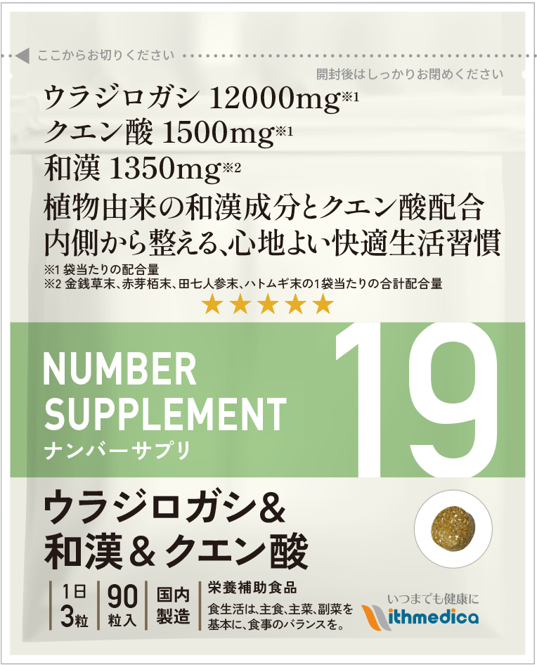 | 商品名 | ナンバーサプリ19(NUMBER SUPPLEMENT 19) ウラジロガシ&三種和漢&クエン酸 |